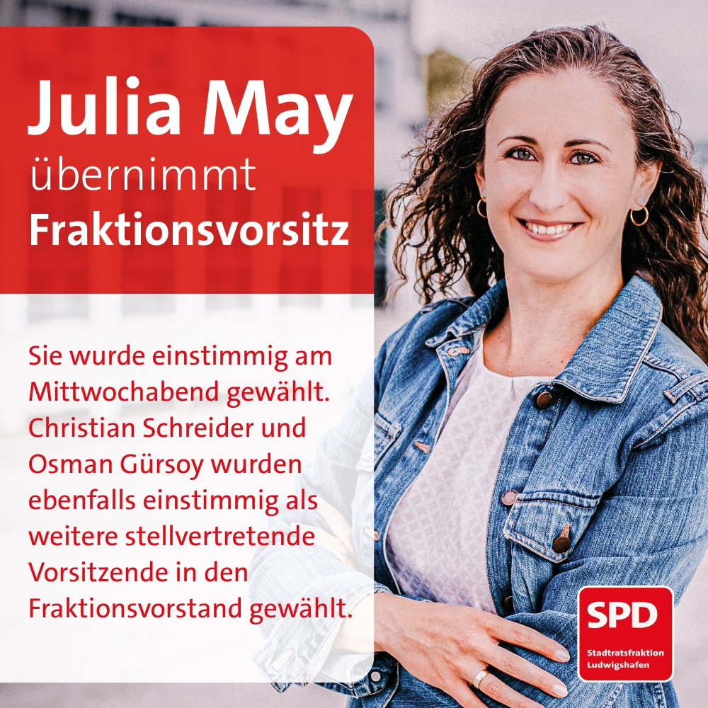Die 40-Jährige Juristin Julia May wurde am Mittwochabend von der SPD-Stadtratsfraktion einstimmig zur Vorsitzenden gewählt. Die bisherige stellvertretende Fraktionsvorsitzende übernimmt den Fraktionsvorsitz zum 1. Juli von David Guthier, der die SPD-Stadtratsfraktion seit 2019 führt.
